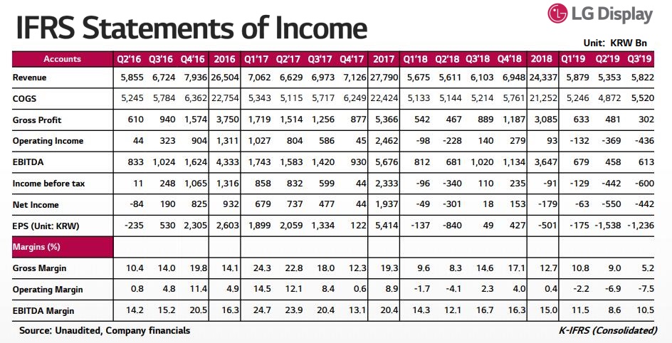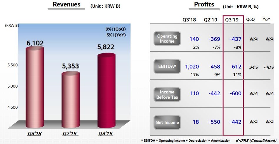 韩国面板大厂LG Display公布第3季财报,营收为5.82兆韩元,较上季度增长9%,较去年同期减少4.6%,低于市场预估的5.99 兆韩元;净亏损为4420亿韩元,上季度净亏损5500亿韩元,去年同期净利润180亿韩元;营业亏损达4360亿韩元,上季度营业亏损为3690亿韩元,相较于去年同期营业利润1400亿韩元,由盈转亏。