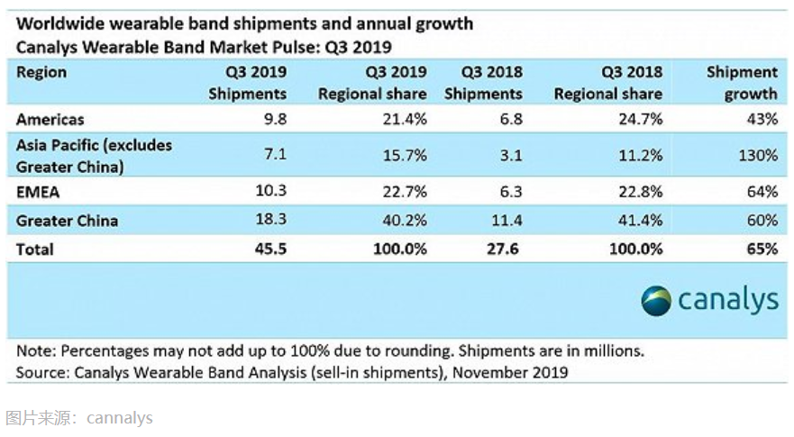 近日,Canalys发布了2019第三季度可穿戴设备出货量报告。报告显示,2019年第三季度全球的可穿戴腕上设备市场增长了65%,大中华地区仍然是出货量最大的地区,占到全球的40%。