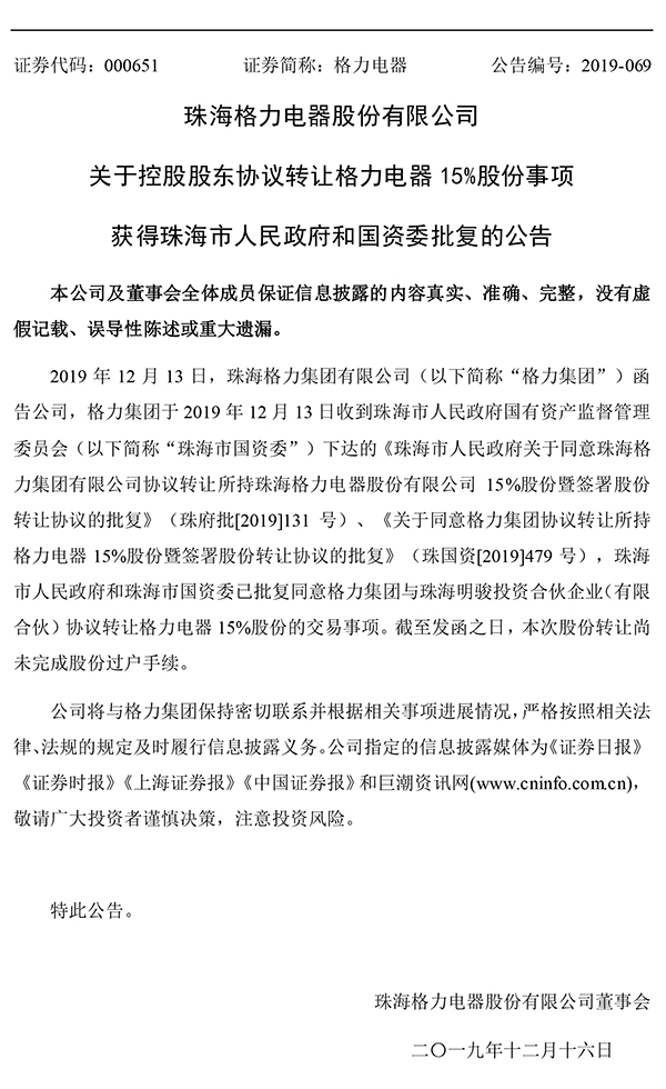 2019年12月13日,珠海格力集团有限公司(以下简称“格力集团”)函告公司,格力集团于2019年12月13日收到珠海市人民政府国有资产监督管理委员会(以下简称“珠海市国资委”)下达的《珠海市人民政府关于同意珠海格力集团有限公司协议转让所持珠海格力电器股份有限公司15%股份暨签署股份转让协议的批复》(珠府批[2019]131号)、《关于同意格力集团协议转让所持格力电器15%股份暨签署股份转让协议的批复》(珠国资[2019]479号),珠海市人民政府和珠海市国资委已批复同意格力集团与珠海明骏投资合伙企业(有限合伙)协议转让格力电器15%股份的交易事项。截至发函之日,本次股份转让尚未完成股份过户手续。