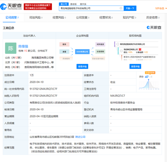 青岛海信智能电子科技有限公司法定代表人为海信集团副总裁陈维强,经营范围包括电子科技领域内的技术研发、技术咨询、技术服务,软件开发,网络技术开发及咨询,房屋租赁,物业管理,餐饮管理服务,会议服务,停车服务、销售:电子产品、家用电器。