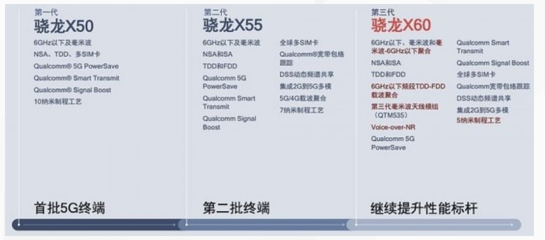 X60首次基于5nm工艺设计,性能、功耗上会比基于 7nm 工艺的 X55 更出色。速率方面,X60 基带能够实现最高达7.5Gbps的下载速度,以及最高达 3Gbps的上传速度。虽说和上一代X55 基本保持一致,但X60 相比X55重点增强了载波聚合能力,支持毫米波-6GHz 以下聚合、6GHz 以下频段 FDD-TDD 聚合以及新推出的 QTM535 天线等。