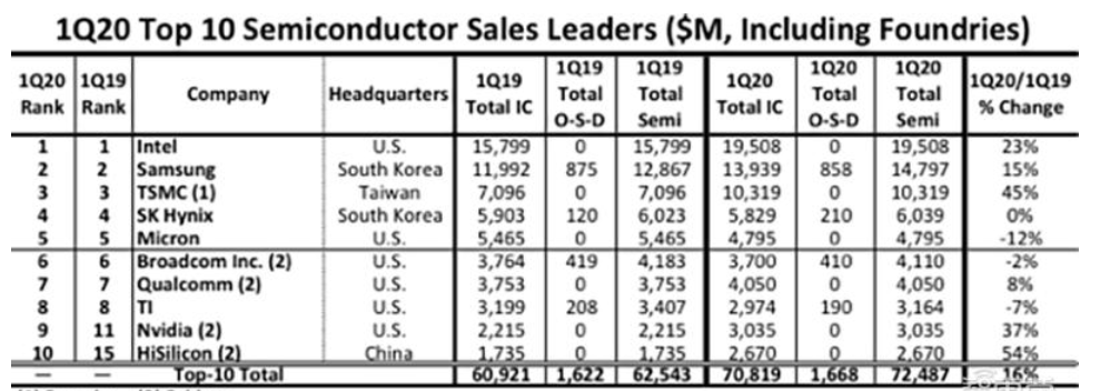 IC Insights数据显示,2020年第一季度排名前十的半导体公司销售额同比增长16%,是全球半导体行业同比增长幅度(7%)的两倍以上。