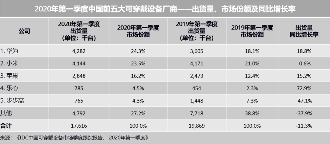 IDC:2020年一季度中国可穿戴设备市场同比下滑11.3%