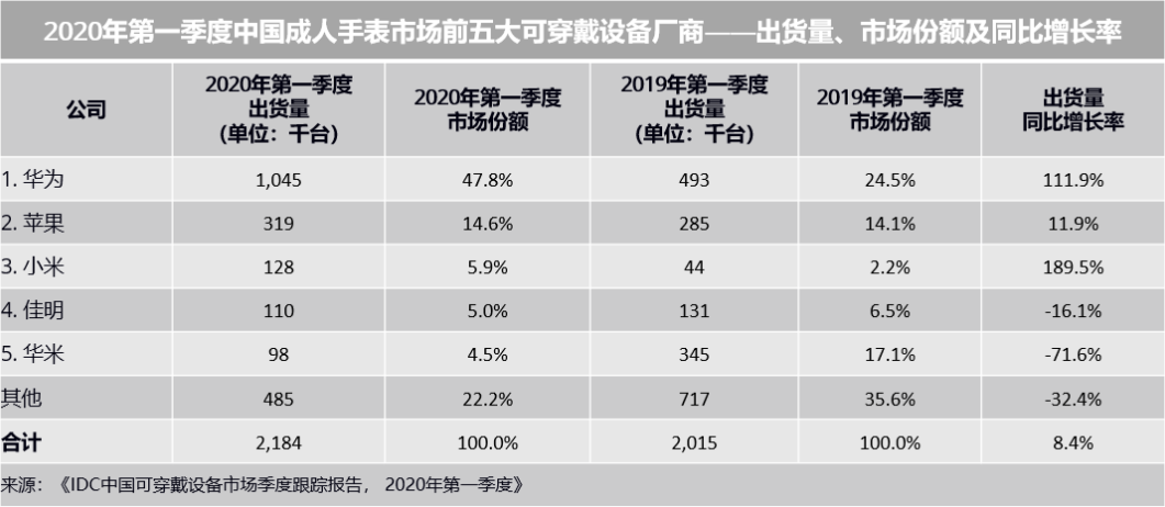 其中,华为凭借出色的渠道运营能力和产品市场号召力,在手表市场上的表现尤其稳健,帮助其逆势增长,跃居中国可穿戴市场第一位。2020年第一季度出货量482.2万台,市场份额24.3%,出货量同比增长18.8%。