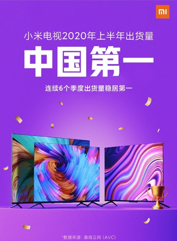 今天上午,小米电视官微表示:奥维云网数据显示,2020年上半年小米电视货量中国第一,并连续六个季度稳居第一。