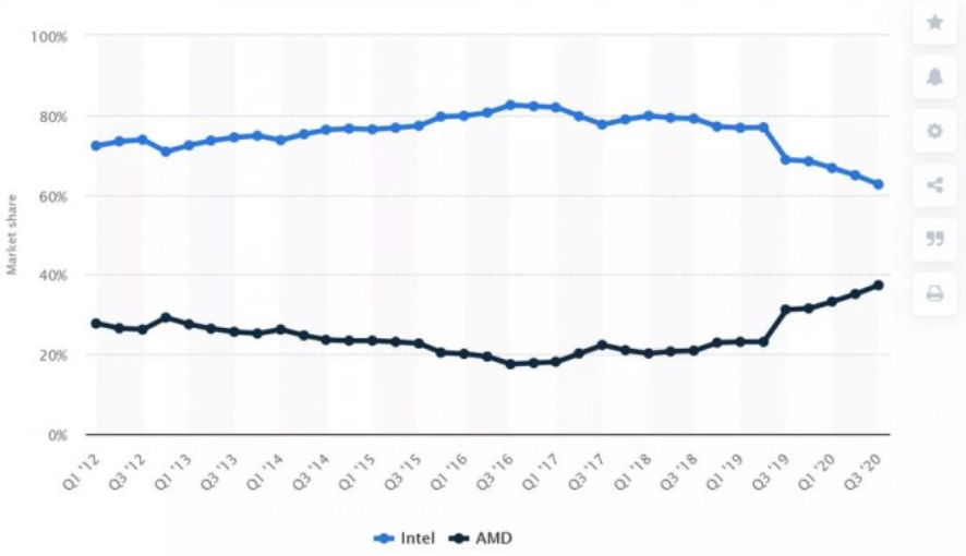 根据 Statista 的分销统计,AMD的处理器市场份额在第三季度达到了37.3%。这是自2012年以来的最高水平,英特尔的市场份额为62.6%,是同期的最低水平。