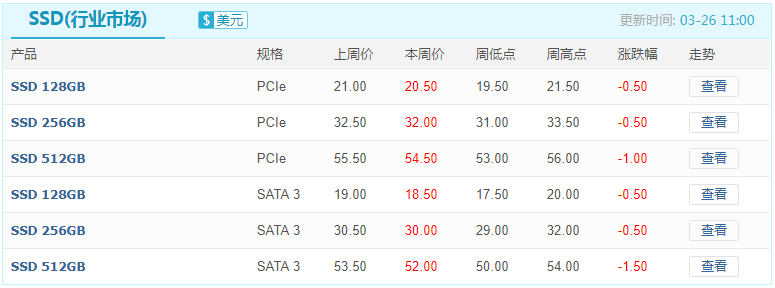 SATA SSD 128GB价格由19美金下跌至18.5美金,256GB价格则从30.5美金跌至30美金,512GB价格由53.5美金跌至52美金。