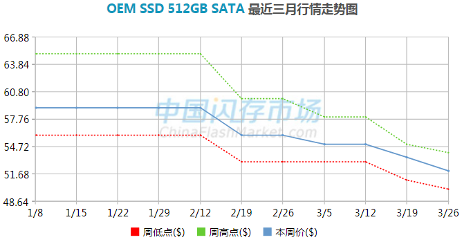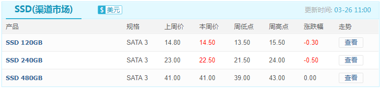 受多方因素影响,本周二(3月26日)SSD价格整体下滑,其中渠道市场SATA SSD价格由14.8美金下跌至14.5美金,240GB价格由23美金下跌至22.5美金。