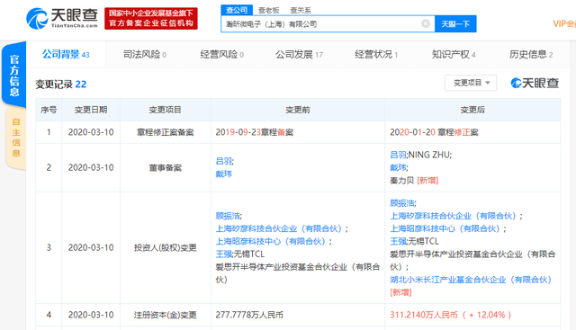 天眼查数据显示,3月10日,湖北小米长江产业基金合伙企业(有限合伙)新增对外投资,入股瀚昕微电子(上海)有限公司,认缴出资约30.86万人民币,持股比例9.92%;此外,新增秦力贝为董事,其注册资本也从约278万增至约311万,增幅为12.04%。