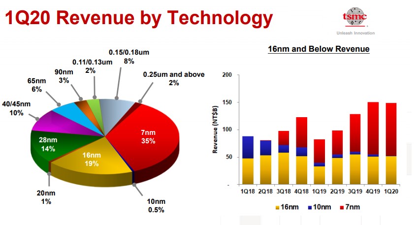 台积电2020年第1季度的晶圆营收额中,7nm制程出货占35%;10nm占0.5%;16nm占19%,包含16nm及更先进制程的营收已达到全季晶圆销售金额的55%。台积电最新的5nm较7nm性能提升15%,能耗提升30%,下一代的3nm较5nm性能提升7%,能耗提升15%,预计在2021年试产,2022年下半年量产。