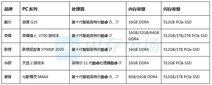 游戏市场成长的背后涌现的是机遇,因此PC大厂开始涉足游戏笔记本市场,其中联想拯救者Y7000P 2020、华硕天选2、戴尔游匣G15等游戏笔记本主流搭配16GB DDR4+512GB/1TB PCIe SSD,而且荣耀猎人 V700游戏本定制版本更是将最高配置提升至64GB+2TB PCIe SSD大容量,正推动游戏笔记本向TB级SSD高容量升级。
