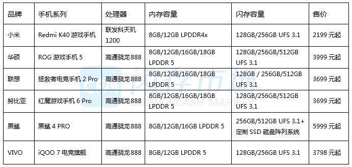 2021上半年,新一代手机新品三星Galaxy S21、小米11、VIVO X60 Pro、OPPO Reno5 Pro、魅族 18主流配置以8GB/12GB LPDDR 5+128GB/256GB/512GB UFS 3.1为主。更有消息称,苹果iPhone13将首次搭配1TB容量,可望引领下一代智能型手机旗舰搭配标杆。